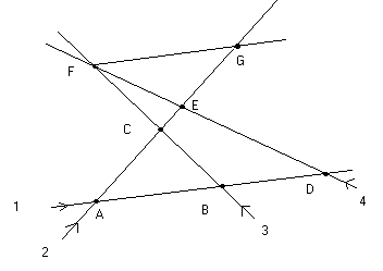 The straight line FG is just an auxiliary line, drawn from F paralel to line 1. The point where it crosses line 2, we'll call it G.