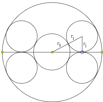 When the five circles are equal, their common radius is r/5; obviously. More can be said, viz., the outer four circles are always equal. Furthermore, their radius is exactly r1 increasing the number of equal circles to 8. The proof is not difficult and is left as an exercise.