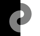 A ring of an uniform gray shade is drawn on the background of two contrasting squares. It's left and right halves acquire independent identities when the pieces are slid vertically against each other: