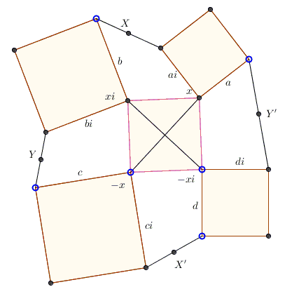 $ \begin{align} 2X &= x+ai+xi+b \\ 2Y &= xi + bi - x + c \\ 2X' &= -x +ci - xi + d \\ 2Y' &= -xi + di + x + a. \end{align} $