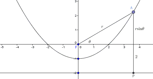 In polar coordinates $x=r\mbox{cos}\theta$ and $y=r\mbox{sin}\theta,$ where $r=\sqrt{x^2+y^2}$ is the distance to the origin, and $\theta$ is the angle between the $x-$axis and the vector from the origin to $(x,y).$ It is convenient to shift the parabola down as to place the focus at the origin:
