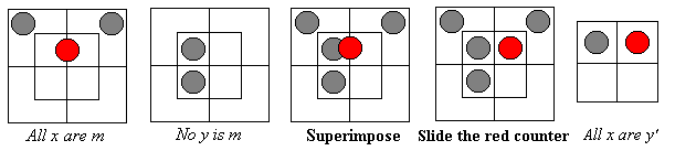 Note that, after superimposing the diagrams, the red counter slides from the fence as a gray counter to the left of it. In the North-West corner there are two gray counters one of which is passed on to the bilateral diagram (Rule 1). A red counter from the North-East corner is also inherited (Rule 2) by the bilateral diagram regardless of the presence of the gray counter. Nothing else is passed in accordance with Rule 3. The conclusion is All x are y' which is equivalent to the combination No xy exist and Some xy' exist.