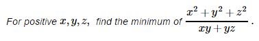 $\displaystyle E \ge \frac{x+z}{2y}+\frac{y}{x+z} \ge 2\cdot\sqrt(1/2)=\sqrt(2).$