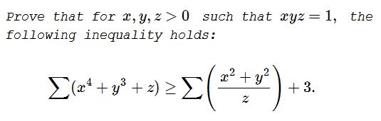 - An Inequality with Cycling Sums $\left(\displaystyle\sum_{cycl}(x^4+y^3+z)\ge \sum_{cycl}\frac{x^2+y^2}{z}+3\right)$