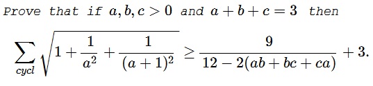 - Dan Sitaru's Cyclic Inequality in Three Variables II $\left(\displaystyle \sum_{cycl}\sqrt{1+\frac{1}{a^2}+\frac{1}{(a+1)^2}}\geq \frac{9}{12-2(ab+bc+ca)}+3\right)$