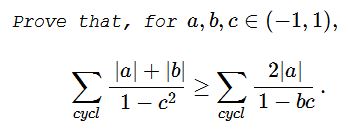 $\displaystyle \frac{|a|}{1-b^2}+\frac{|a|}{1-c^2}\ge \frac{2|a|}{1-bc}\\ \displaystyle \frac{|b|}{1-c^2}+\frac{|b|}{1-a^2}\ge \frac{2|b|}{1-ca}.$