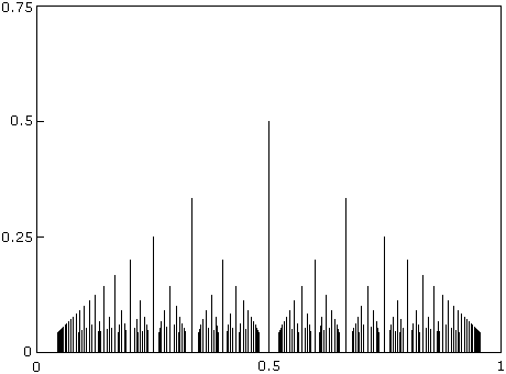 D(x) = 1/q if x is rational and can be reduced to x = p/q