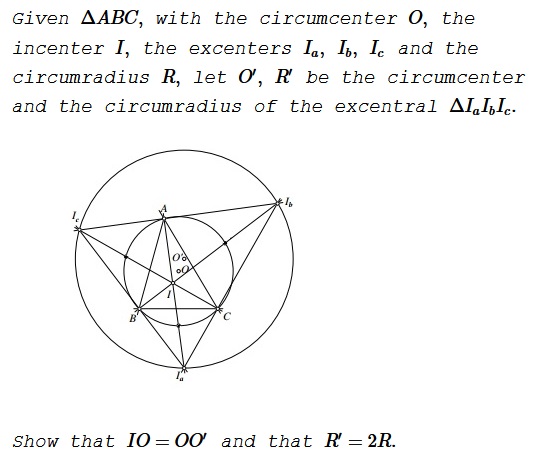 In other words, the segments $II_a,$ $II_b,$ $II_c$ are each halved by the circumcircle $(ABC),$ implying that the circumcircle $(I_aI_bI_c)$ is homothetic with the circumcircle $(ABC)$ from the incenter $I,$ the factor of homothety being $2.$ Thus $R'=2R$ and $IO'=2IO,$ i.e., $IO=OO'.$
