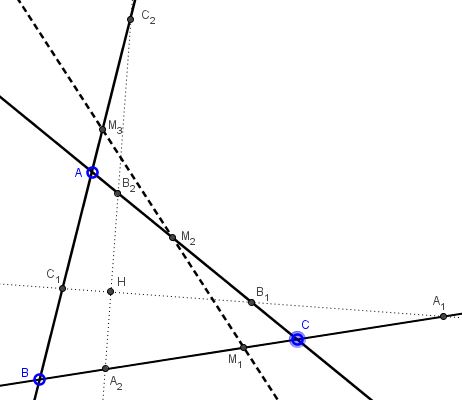 As has already been done previously, we choose to place the origin of the coordinate system at the orthocenter and the axes along the two given lines. We thus may specify the coordinates of the points involved: $A_{1}(a,0),$ $A_{2}(0,b),\;$ $B_{1}(c,0),$ $B_{2}(0,d),\;$ $C_{1}(e,0),$ $C_{2}(0,f).\;$ From here, $M_{1}(ta,(1-t)b),\;$ $M_{2}(tb,(1-t)d),\;$ $M(te,(1-t)f).$