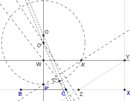 Step 2: Select an arbitary point $P'$ on the perpendicular bisector of $BC$ and find point $P'$ on $YW$ such that $A'P'\parallel YZ.$