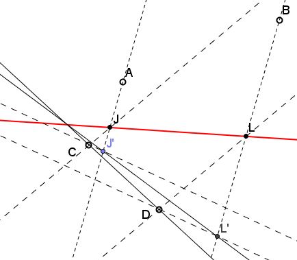 Fix parallels through $A$ and $B$ and consider two pairs of parallels through $C$ and $D.$ The first pair gives intersection points $J$ and $L,$ the second the intersections $J'$ and $L'.$ Triangles $CJJ'$ and $DLL'$ have pairwise parallel sides and are, therefore, homothetic. The three lines $JL,$ $J'L',$ and $CD$ all pass through the center of the homothety which, thus, lies on $CD.$ Fixing one direction and, say, points $J$ and $L$ and letting parallels through $C$ and $D$ change direction we see that all resulting lines $J'L'$ pass through the same point - the intersection of $CD$ and $JL.$