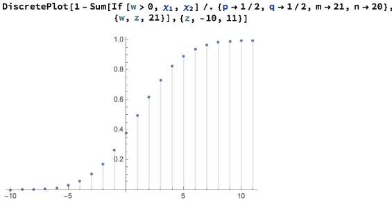$\displaystyle \chi(w)=\left\{ \begin{array}{ll} (1-p)^n p^w \binom{m}{w} (1-q)^{m-w} \, _2F_1\left(-n,w-m;w+1;\frac{p^2}{(p-1) (q-1)}\right)\,,w \ge 0 \\ \\ (1-q)^m p^{-w} \binom{n}{-w} (1-p)^{n+w} \, _2F_1\left(-m,-n-w;1-w;\frac{p^2}{(p-1) (q-1)}\right)\,,w \lt 0 \end{array}\right. $