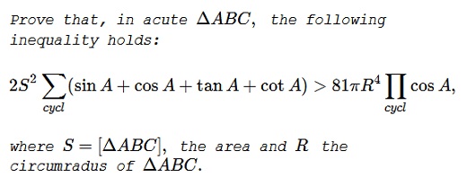 - An Inequality with Sin, Cos, Tan, Cot, and Some $(2S^2\displaystyle\sum_{cycl}(\sin A+\cos A+\tan A+\cot A)\gt 81\pi R^4\prod_{cycl}\cos A)$